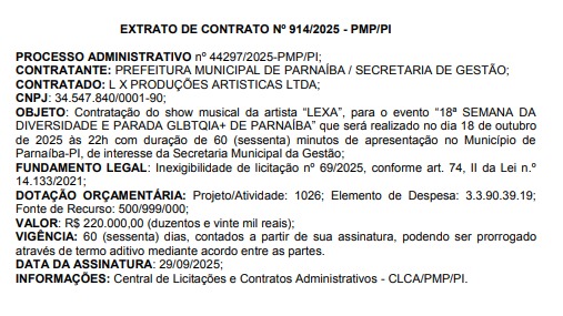 Emanuel Brito gasta mais de R$ 200 mil com show de Lexa na Parada LGBTQIA+ e gera críticas em Parnaíba Por Delta | 07/10/2025 | Sem Comentários O prefeito de Parnaíba, Francisco Emanuel Brito, voltou a ser alvo de críticas após a divulgação do extrato de contrato nº 914/2025, que mostra a contratação da cantora Lexa por R$ 220 mil para se apresentar na 18ª Semana da Diversidade e Parada LGBTQIA+ do município. O evento, previsto para o dia 18 de outubro, será custeado pela Secretaria Municipal de Gestão, com base em uma inexigibilidade de licitação, mecanismo que dispensa concorrência pública sob justificativa de exclusividade artística. O alto valor do cachê e a escolha da atração geraram questionamentos dentro e fora da comunidade local. Em 2024, a Parada LGBTQIA+ contou com a presença de Pabllo Vittar, que atraiu uma multidão e foi amplamente elogiada pela performance e impacto cultural. Este ano, no entanto, parte do público expressou descontentamento nas redes sociais, considerando a escolha de Lexa “menos representativa” e o investimento “exagerado” diante de outras demandas sociais e culturais da cidade. Fontes da própria gestão admitem que o contrato, de R$ 220 mil por uma hora de show, foi assinado no dia 29 de setembro, com vigência de 60 dias. O documento ainda prevê a possibilidade de prorrogação, o que pode elevar o custo final do evento. Críticos da administração apontam que o gasto contrasta com a falta de apoio financeiro a grupos locais, muitos dos quais enfrentam dificuldades para se manter ativos. “É incoerente gastar essa quantia em uma atração nacional enquanto associações e artistas de Parnaíba lutam para receber pequenas verbas”, comentou um produtor cultural da cidade. A contratação reacende o debate sobre prioridades na aplicação dos recursos públicos e a falta de transparência na escolha das atrações. Enquanto isso, o prefeito Emanuel Brito, já envolvido em polêmicas recentes com o Legislativo municipal, volta ao centro das atenções, agora por um contrato que, além de caro, dividiu opiniões dentro da própria comunidade que o evento pretende homenagear. Compartilhe isso: Clique para compartilhar no X(abre em nova janela) 18+ Clique para compartilhar no Facebook(abre em nova janela) Facebook Clique para compartilhar no WhatsApp(abre em nova janela) WhatsApp Clique para compartilhar no Telegram(abre em nova janela) Telegram Clique para imprimir(abre em nova janela) Imprimir Curtir isso:Curtir Carregando... Relacionado 0 Comentários Deixe o seu comentário! Nome: Email: Website: Mensagem: Δ Cancelar Resposta