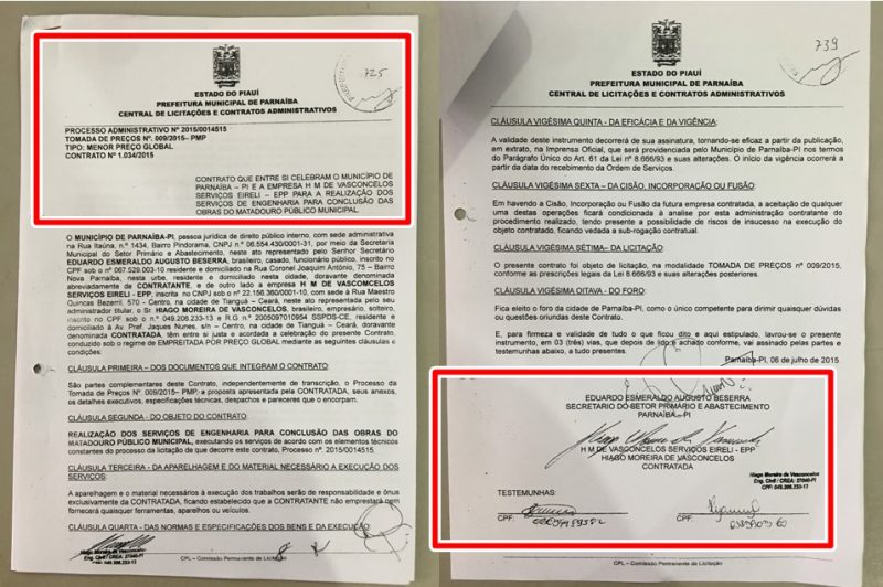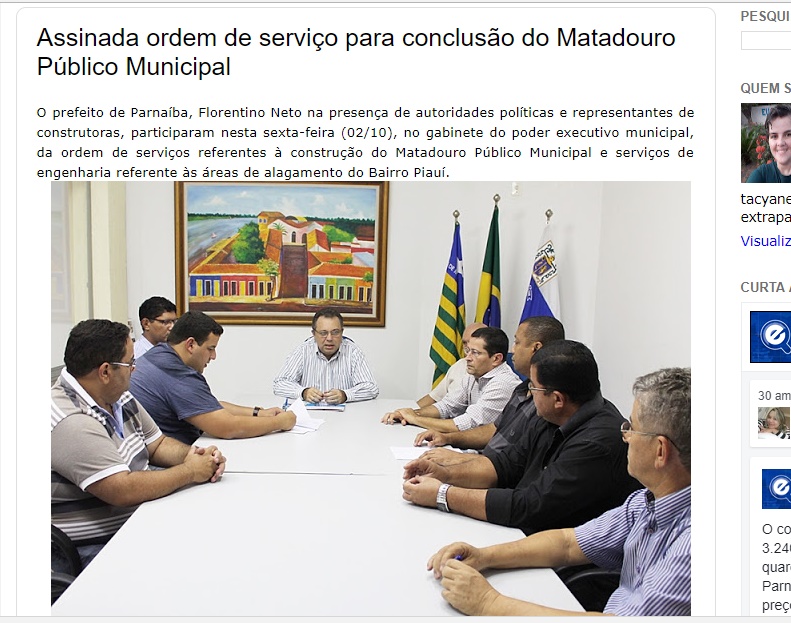 Ordem de serviço do matadouro de Parnaíba foi assinada por Florentino em 2015 Por Delta | 23/08/2018 | Sem Comentários De Preto, a frete do Vereador Diniz o engenheiro Juscelino Val, preso na operação, em reunião com Prefeito Florentino Na manhã desta quinta-feira (23), aconteceu a 3ª Fase de Operação Escamoteamento, que combate a uma extensa organização criminosa acusada de fraudar licitações na prefeitura de Buriti dos Lopes e outras cidades da região. Blogs patrocinados por grupos políticos de Parnaíba tentaram veicular a imagem do Prefeito Mão Santa (SDD) a operação que prendeu o engenheiro Juscelino Val, irmão do ex-prefeito de Buriti do Lopes que também foi preso acusado de participar do esquema.O fato é que a obra citada pelos portais é o matadouro público e de acordo com documentos e registro de imprensa da época, a ordem de serviço e a licitação da empresa citada aconteceu na gestão do então Prefeito Florentino Neto (PT). O ato de assinatura de contrato foi realizado em seu gabinete no dia 2 de outubro de 2015, tirando quaisquer responsabilidades da atual administração municipal.Segundo o Grupo de Atuação Especial de Combate ao Crime Organizado (Gaeco) e a Polícia Federal, a quadrilha fraudava licitações para beneficiar empresas do grupo investigado. No caso de Parnaíba, a responsabilidade da licitação e da assinatura do contrato foi do ex-prefeito do PT Florentino Neto. Mesmo sem informações sobre a inclusão ou não desta obra nas citadas investigações, tentamos contato com o ex-prefeito, mas não conseguimos êxito. Vale ressaltar que a PF e a GAECO afirmam que as fraudes aconteceram em Buriti dos Lopes e Cocal entre 2013 e 2016. Além do matadouro que foi assinado por Florentino, existem outras obras da mesma empresa na gestão petista, dentre elas, a reforma do antigo anexo da Escola Municipal Cândido Athayde, no bairro Rosápolis, além da ampliação das escolas Benedito dos Santos Lima, no bairro Piauí e Antônio Thomaz, no bairro João XXXIII, além da obra de reforma da escola Marielise Mourão, também no bairro João XXIII. Compartilhe isso: Clique para compartilhar no X(abre em nova janela) 18+ Clique para compartilhar no Facebook(abre em nova janela) Facebook Clique para compartilhar no WhatsApp(abre em nova janela) WhatsApp Clique para compartilhar no Telegram(abre em nova janela) Telegram Clique para imprimir(abre em nova janela) Imprimir Curtir isso:Curtir Carregando... Relacionado 0 Comentários Deixe o seu comentário! Nome: Email: Website: Mensagem: Δ Cancelar Resposta