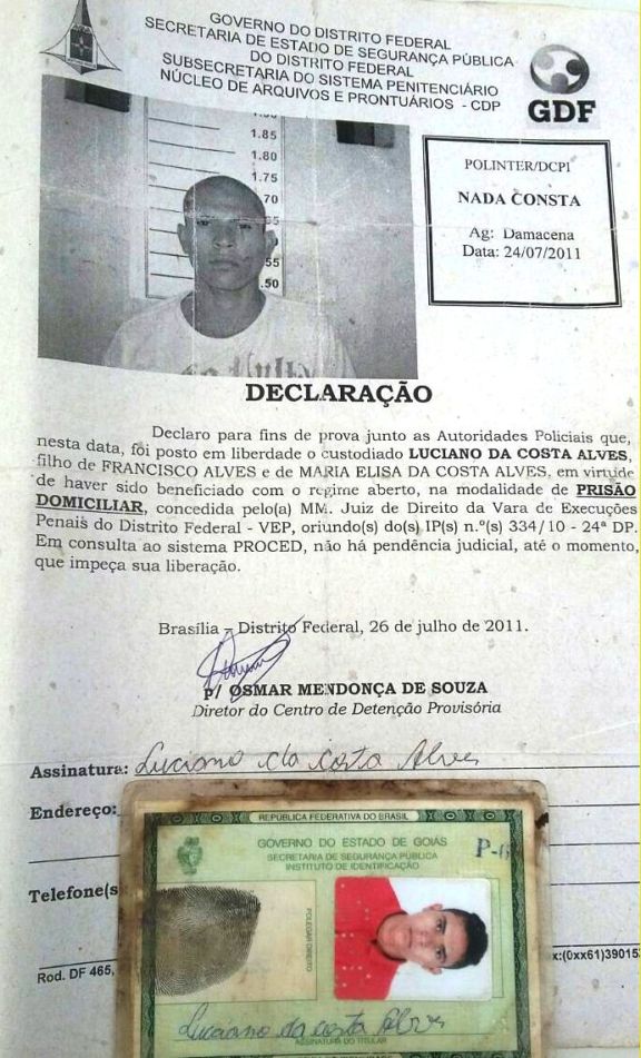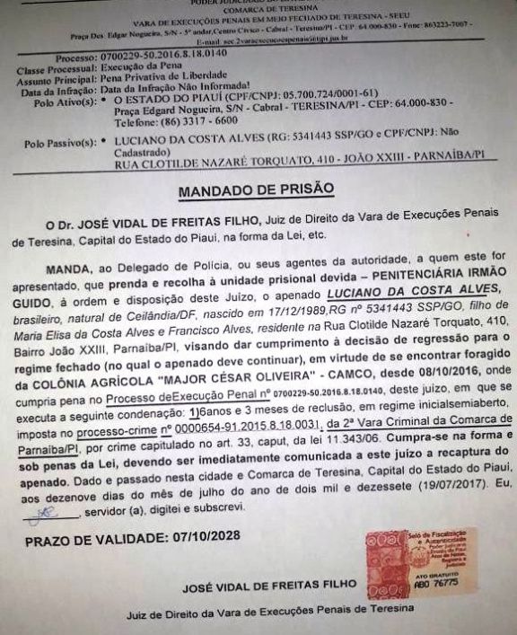 Policia Militar captura fugitivo da justiça em Parnaíba Por Delta | 13/04/2018 | Sem Comentários Uma patrulha da Policia Militar sob comando do sargento Farlon Machado – capturou por volta das 06hs da manhã desta sexta-feira (13/04), o nacionalLUCIANO DA COSTA ALVES, de 28 anos. A captura foi efetuada no endereço do nº 55 da Rua Santo Agostinho – bairro Planalto Mont Serrat. Contra Luciano havia um mandado de prisão em aberto com validade até o mês de Outubro do ano de 2028, do século em evidência – expedido pela Vara de Execuções Penais da Comarca de Teresina, capital do estado do Piauí. Após cair nas garras da policia, Luciano da Costa Alves foi encaminhado à central de flagrantes. Cópia do mandado De acordo com o sargento Farlon Machado – Luciano era fugitivo da Penitenciária Major Cesar em Teresina. Chegou a cumprir pena na Penitenciária Mista de Parnaíba. É natural de Ceilândia no Distrito Federal. Luciano da Costa Alves – Foto atual(13/04/2018). A policia investiga sua estadia em Parnaíba desde o mês de março de 2017. Compartilhe isso: Clique para compartilhar no X(abre em nova janela) 18+ Clique para compartilhar no Facebook(abre em nova janela) Facebook Clique para compartilhar no WhatsApp(abre em nova janela) WhatsApp Clique para compartilhar no Telegram(abre em nova janela) Telegram Clique para imprimir(abre em nova janela) Imprimir Curtir isso:Curtir Carregando... Relacionado 0 Comentários Deixe o seu comentário! Nome: Email: Website: Mensagem: Δ Cancelar Resposta