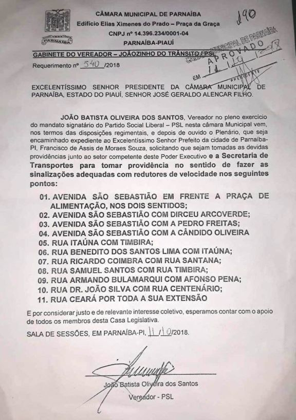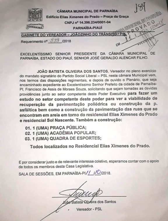 Requerimentos do vereador João do Trânsito são aprovados pela Câmara Municipal de Parnaíba Por Delta | 20/10/2018 | Sem Comentários O vereador Joãozinho do Trânsito(PSL), teve requerimento aprovado onde solicita urgentemente a sinalização adequada para Parnaíba, como também fazer as faixas necessárias e pintar as existentes pelo fato dos constantes acidentes ocorrendo em ruas e avenidas da cidade, devido a inexistência das mesmas. Veja abaixo cópia do requerimento e a relação das ruas e avenidas: Também teve outro requerimento aprovado para os conjuntos Elias Ximenes do Prado e Sol Nascente, no bairro Dirceu Arcoverde, onde pede melhorias, como a recuperação de calçamento, pavimentação asfáltica, quadras esportivas e academias de saúde. Compartilhe isso: Clique para compartilhar no X(abre em nova janela) 18+ Clique para compartilhar no Facebook(abre em nova janela) Facebook Clique para compartilhar no WhatsApp(abre em nova janela) WhatsApp Clique para compartilhar no Telegram(abre em nova janela) Telegram Clique para imprimir(abre em nova janela) Imprimir Curtir isso:Curtir Carregando... Relacionado 0 Comentários Deixe o seu comentário! Nome: Email: Website: Mensagem: Δ Cancelar Resposta