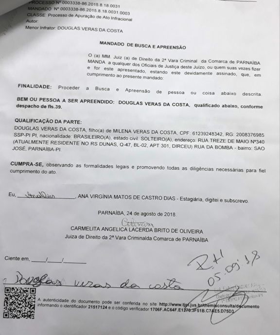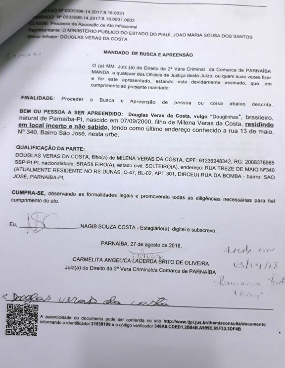Suspeito de vários assaltos é definitivamente capturado em Parnaíba Por Delta | 18/10/2018 | Sem Comentários Douglas Veras da Costa, o Douguinha, residente na Q-47, BL- 02, C-301, conjunto Dunas, bairro Dirceu Arcoverde em Parnaíba, completou maioridade no último dia 07/09/2018 e foi autuado por roubo na manhã desta quarta-feira(17), após ser capturado pelo sargento Farlon Machado durante audiência no Fórum de Parnaíba. Contra ele havia dois mandados de busca e apreensão – expedidos ainda quando era menor de idade. A força tática o conduziu até à central de flagrantes. DOS ROUBOS Douguinha foi reconhecido por duas vítimas como sendo autor de dois roubos ocorridos da última terça-feira(16). O primeiro ocorreu por volta das 17hs em uma espetaria no conjunto Broder Ville. Douguinha e um comparsa adentraram armados no local e anunciaram o assalto. Deu uma violenta coronhada na cabeça de uma vítima, tomando-lhe o celular e mais R$ 350 reais em especie. A dupla ainda roubou outros clientes da espetaria e fugiu do local. O segundo roubo ocorreu por volta das 18hs nas proximidades do residencial Dunas, bairro Dirceu Arcoverde. Um senhor se deslocava para casa em cia da esposa numa moto pop 110cc, quando foi surpreendido por uma dupla armada anunciando assalto. A moto foi tomada e a vítima ameaçada de levar um tiro. A motocicleta usada pela dupla, uma FAN PRETA foi abandonada no local com pneu furado. Diante do delegado, Douguinha negou tais acusações e disse que estava na casa de sua avó no bairro São José no momento destes roubos. Ele também é suspeito de ter praticado ao final da tarde do dia 16, um latrocínio tentado no bairro João XXIII. Caso sendo investigado. O delegado Igor da Rocha Gadelha, o autuou no crime de roubo em concurso de pessoas e com emprego de arma de fogo. Cópia dos mandados Compartilhe isso: Clique para compartilhar no X(abre em nova janela) 18+ Clique para compartilhar no Facebook(abre em nova janela) Facebook Clique para compartilhar no WhatsApp(abre em nova janela) WhatsApp Clique para compartilhar no Telegram(abre em nova janela) Telegram Clique para imprimir(abre em nova janela) Imprimir Curtir isso:Curtir Carregando... Relacionado 0 Comentários Deixe o seu comentário! Nome: Email: Website: Mensagem: Δ Cancelar Resposta